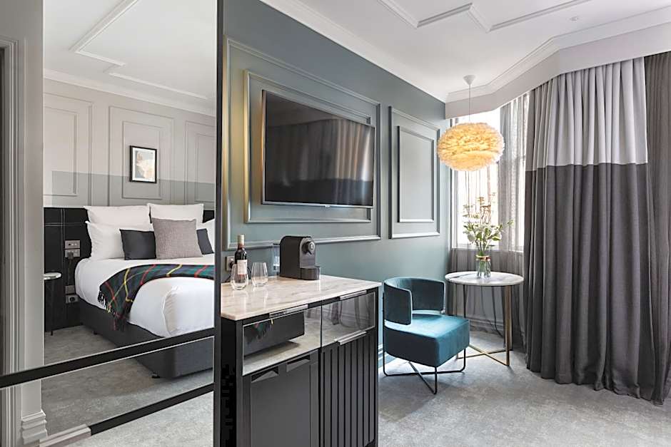The Mason Suite is inspired by the heritage of Scottish settlers. These boutique rooms feature a separate lounge area, high ceilings and sweeping views of Princes Street. Also included is a 65 inch Smart TV, a digital compendium and complimentary high speed WiFi. A selection of Pure Leaf Single Origin teas and a capsule coffee machine with a range of coffee blends are provided. Complimentary bathroom toiletries are also included. The hotel is a member of the Weka plastic recycling program.